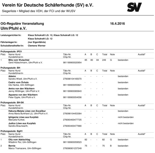 Die Hunde Amira und Ancor von den Wächtern erhielten SG in der Jugendklasse Hündinnen bzw. Rüden Langstockhaar und Lilly vom Höllbachgrund erhielt V in der Gebrauchshundeklasse Hündinnen Langstockhaar. Diese drei Hunde wurden von Jugendlichen aus der LG Württemberg geführt.