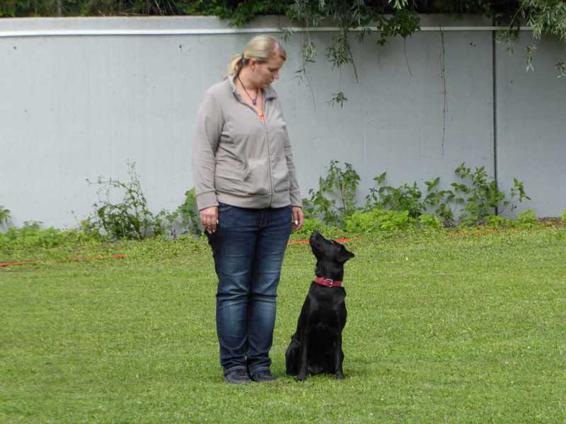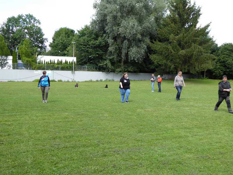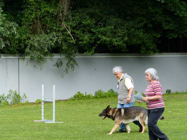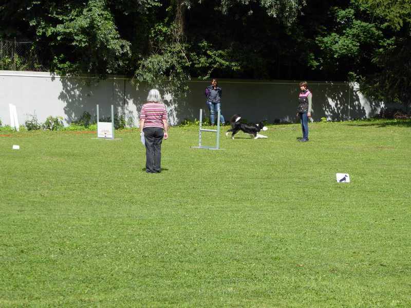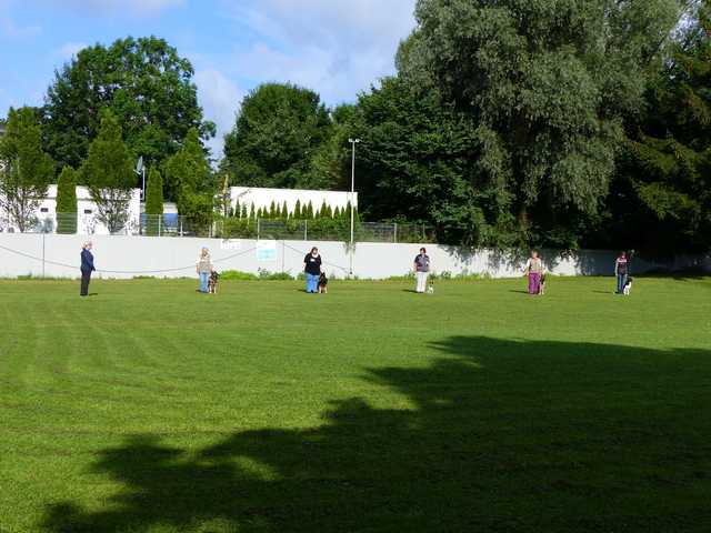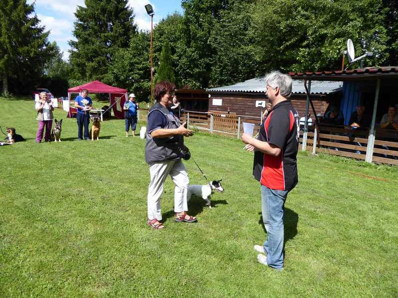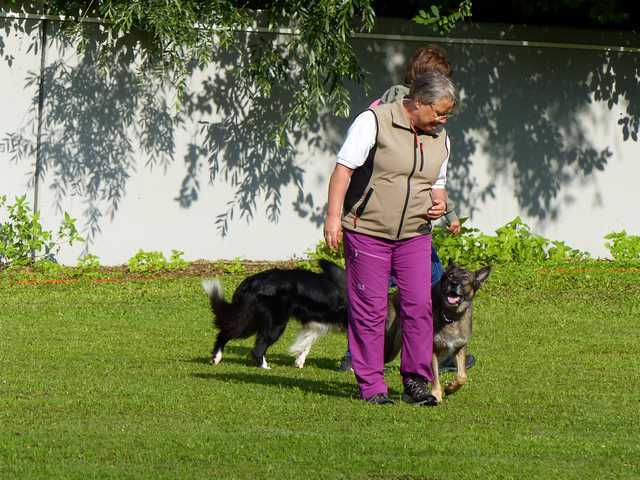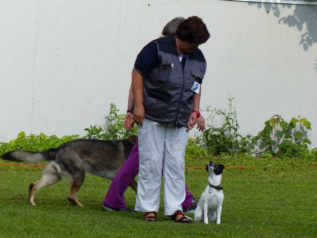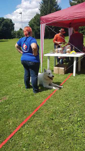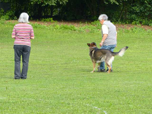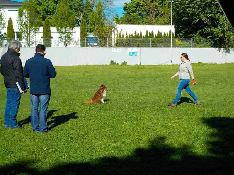 Richter Rieker und Richteranwärter Werner prüften zuerst 9 Teams in der Unterordnungsarbeit der BH-Prüfung, sowie 2 Teams die zur BgH1 antraten. Bei der BH-Prüfung hatte ein Hund auf "Bitte spiel mit mir"-Modus umgeschaltet und die Prüfung leider nicht bestanden. Bei den BgH1-Teams musste die fast 10 jährige Hündin Liss leider abbrechen, da sie sich vermutlich kurz vor der Prüfung gezerrt hatte und nicht mehr ohne Schmerzen laufen konnte.