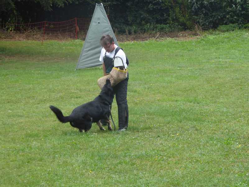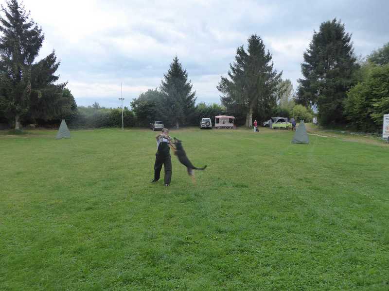 Zügig ging es weiter mit dem Programmpunkt „Schutzdienst-Impressionen“. Sehr knackig wurden dem Publikum die Grundelemente vorgeführt wie das Revieren, das Schicken auf den Helfer und Stellen und Verbellen. Wobei letzteres mit einer kleinen Showeinlage ausgeschmückt wurde, hierbei spielte ein Kürbis die Hauptrolle.