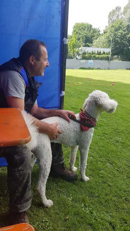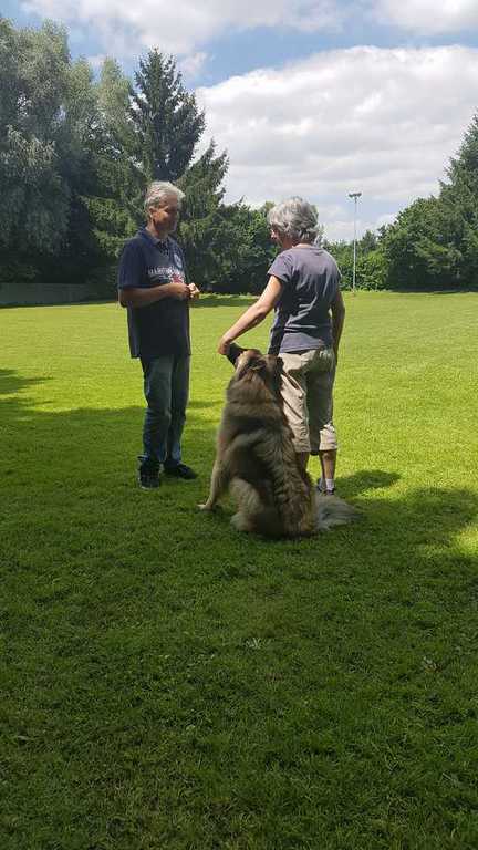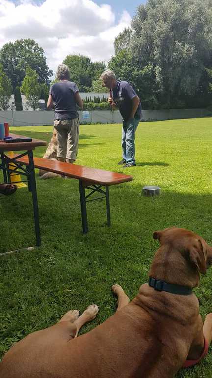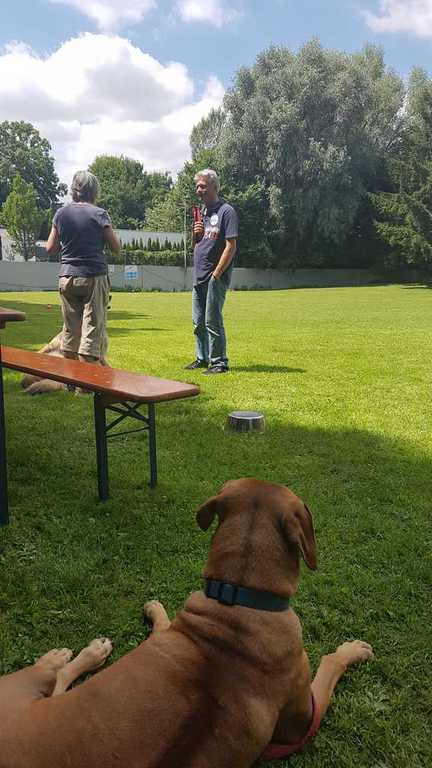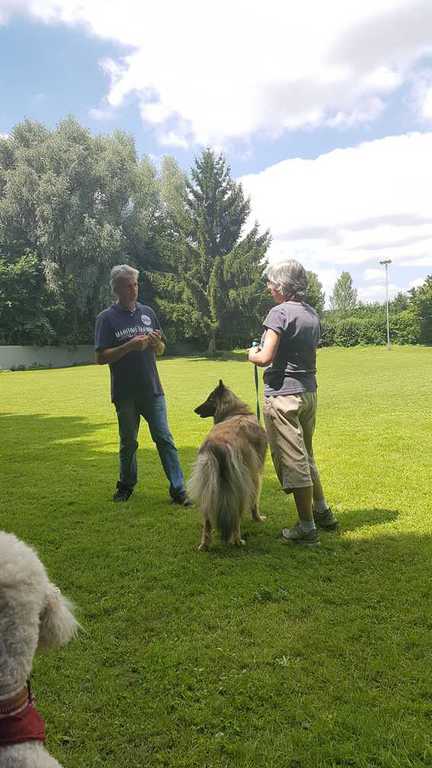 Während wir uns zwischendrin ausruhten, durften Frauchen & Herrchen fleißig die theoretische Praxis für unser weiteres Training besprechen. Üben durften wir dann auch wieder. Dinge, wie macht sich mein Frauchen & Herrchen interessant für uns, Aufwärmübungen, Dehnübungen, Wendungen, wie spielt man richtig mit uns, Motivation- und Einstimmübungen, Sitz, Platz, Steh, die Grundstellung, die Fußposition, Apportieren und noch einiges mehr – aber was ich noch nicht wusste, dass ich wohl wenn ich mich ganz arg konzentriere ein „Team-Face“ mache. Natürlich auch nur, wenn sich mein Herrchen ebenso anstrengt. Das ist was – und jetzt wartet mein Herrchen auch immer darauf. Mal schauen wie und wann ich ihn damit überraschen kann. ;-) Meine Lieblings-übung war: Knuddeln und Belohnen.